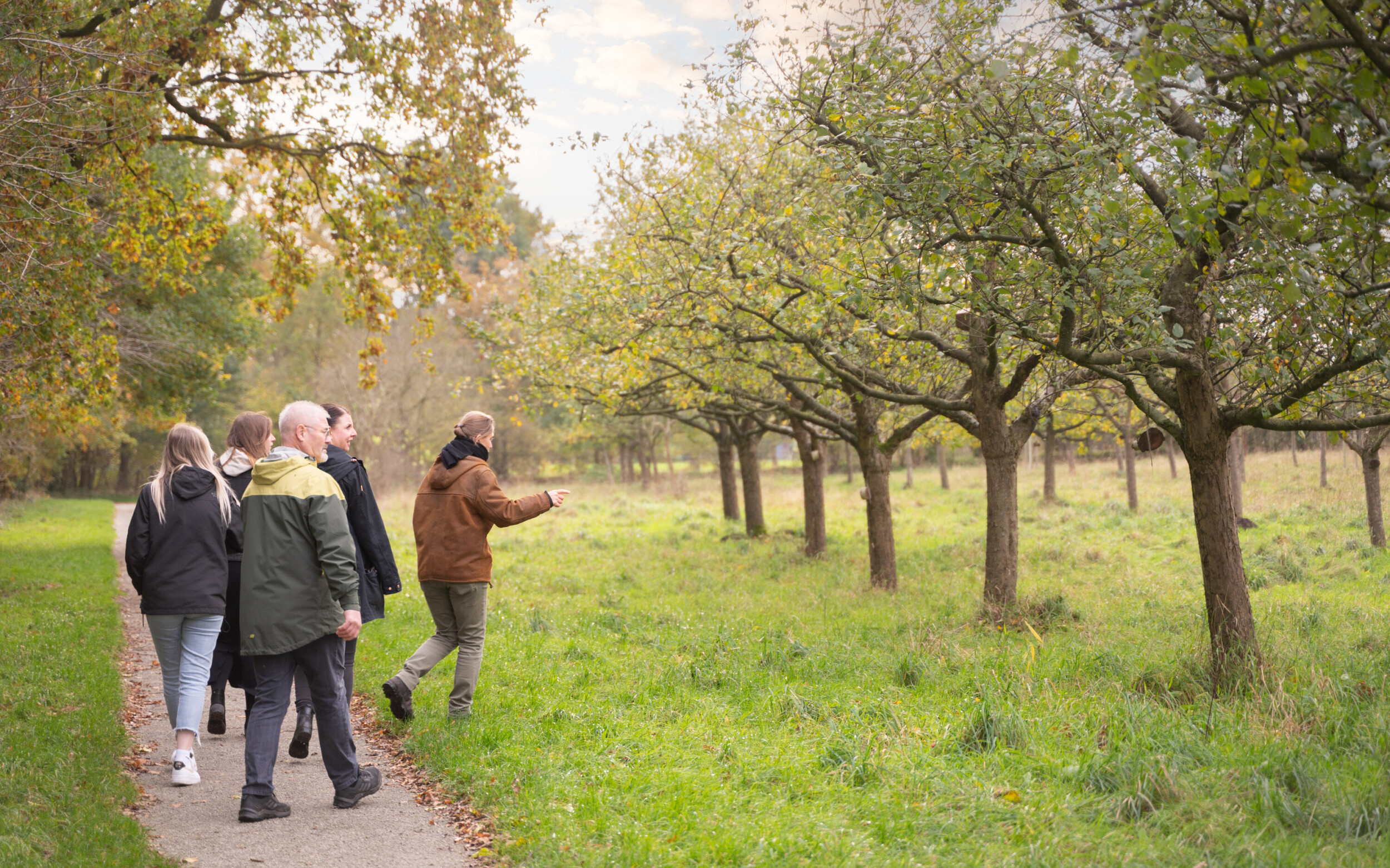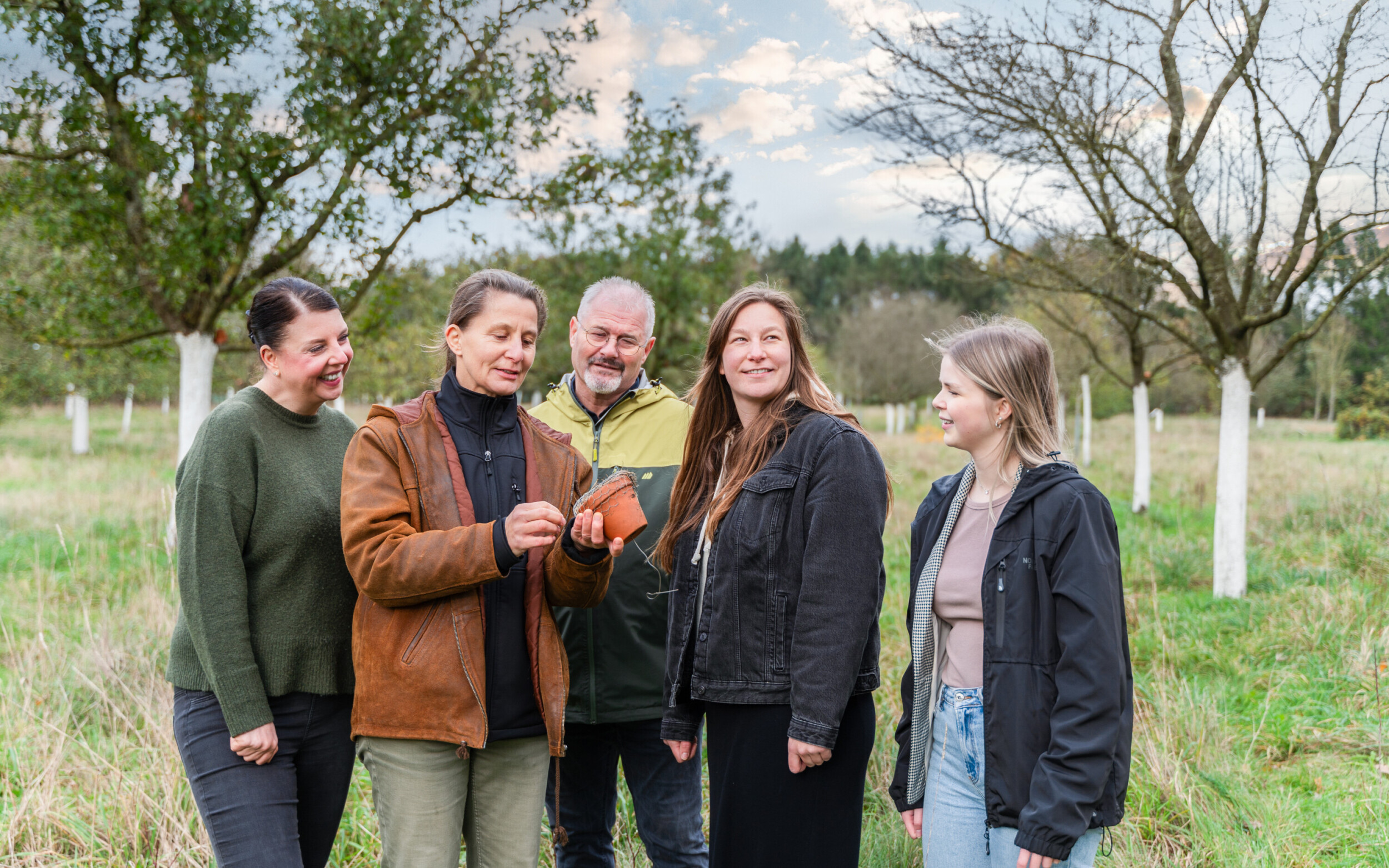 Lecker geht es zumindest zur Erntezeit auf der Streuobstwiese zu, auf der alte Obstbaumsorten den Platz früherer Ackerflächen einnehmen. Ab dem Frühjahr schwirren hier Bienen und andere Insekten durch die Luft und Kleinvögel beziehen die zahlreichen Nistkästen oder suchen Schutz in der Wallhecke aus heimischen Gehölzen. Eine kleine Picknick-Ecke lädt zur Rast ein. Eine Kooperationsschule unterstützt den OOWV von der Baumpflege bis zur Apfelernte. Die Schülerinnen und Schüler der Oberschule Wiefelstede säen etwa im Frühjahr Blühfenster aus. Angeleitet von der Landschaftskammer bestimmen sie mit Bodenproben den Nährstoffbedarf der Obstbäume und bringen nur so viel Mist als Dünger aus wie nötig. Am „Tag des Apfels“ wird geerntet, Apfelmus gekocht und mit einer mobilen Presse Apfelsaft gewonnen – lecker!