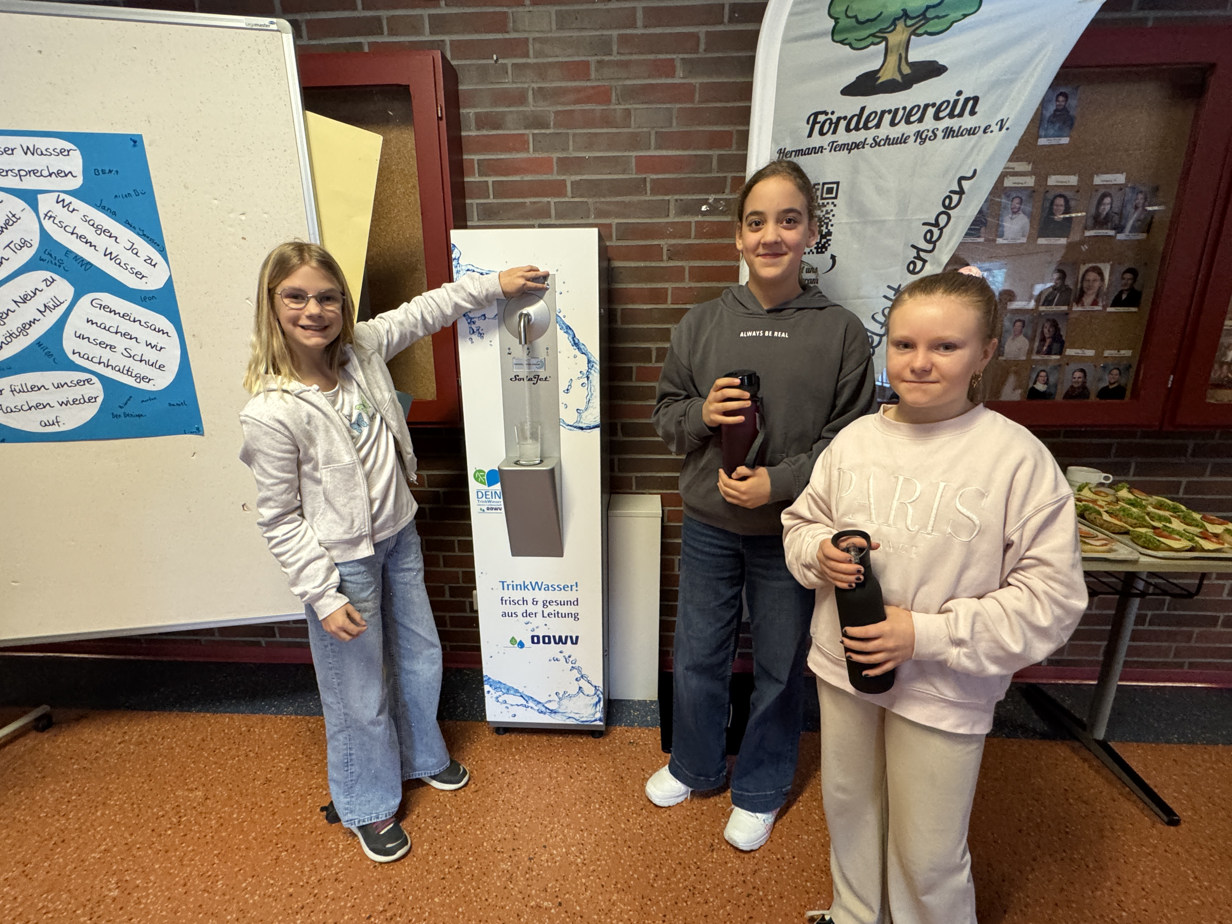 Sophia Niehuisen (von links), Marie Vogt und Sophie Fleßner freuen sich, dass es im Forum der IGS Ihlow immer frisches Wasser gibt.