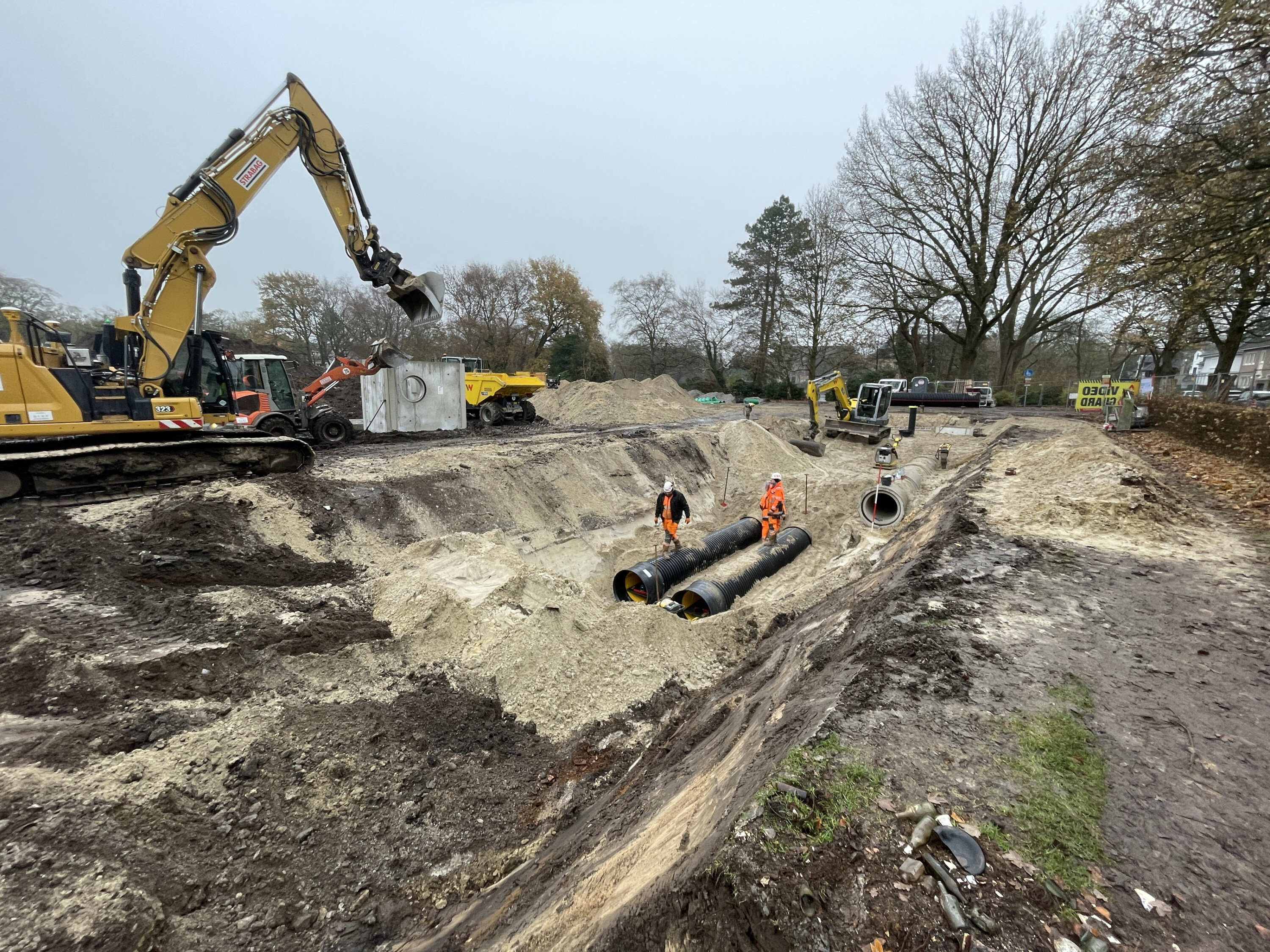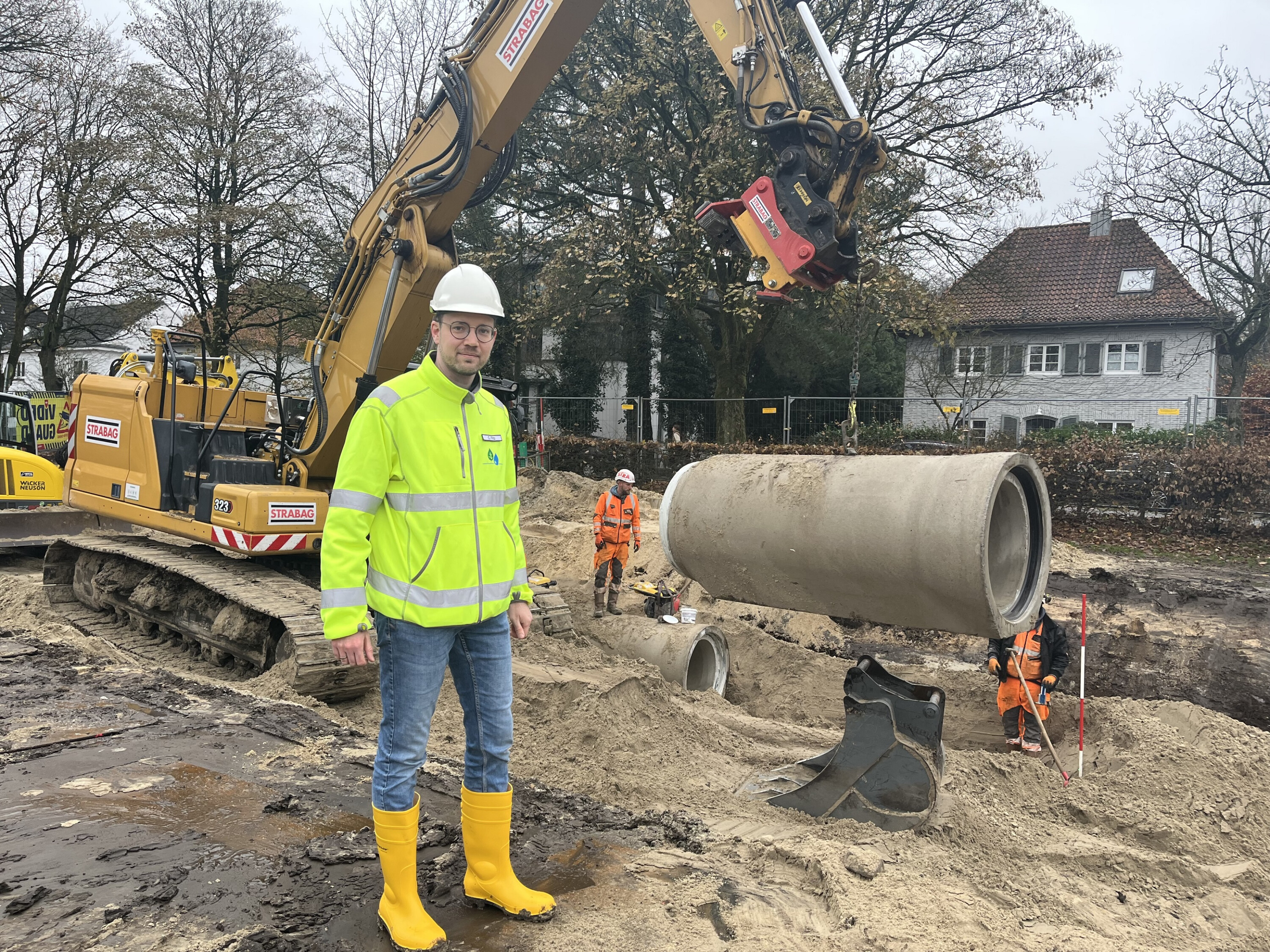 Die Arbeiten in diesem Bauabschnitt brachten zu Beginn gleich Herausforderungen mit sich. „Unter der Dobbenwiese liegt eine historische Deponie, die zunächst archäologisch untersucht werden musste“, erklärt Christian Flitz. „Zudem gibt es im Bereich der künftigen Straßenbauarbeiten alte, verfüllte Entwässerungsgräben mit verbliebenen Hohlräumen, in denen noch kontinuierlich Wasser fließt. Deshalb ist hier besondere Vorsicht geboten, damit dieses Wasser beim Aushub nicht unkontrolliert austritt.“
