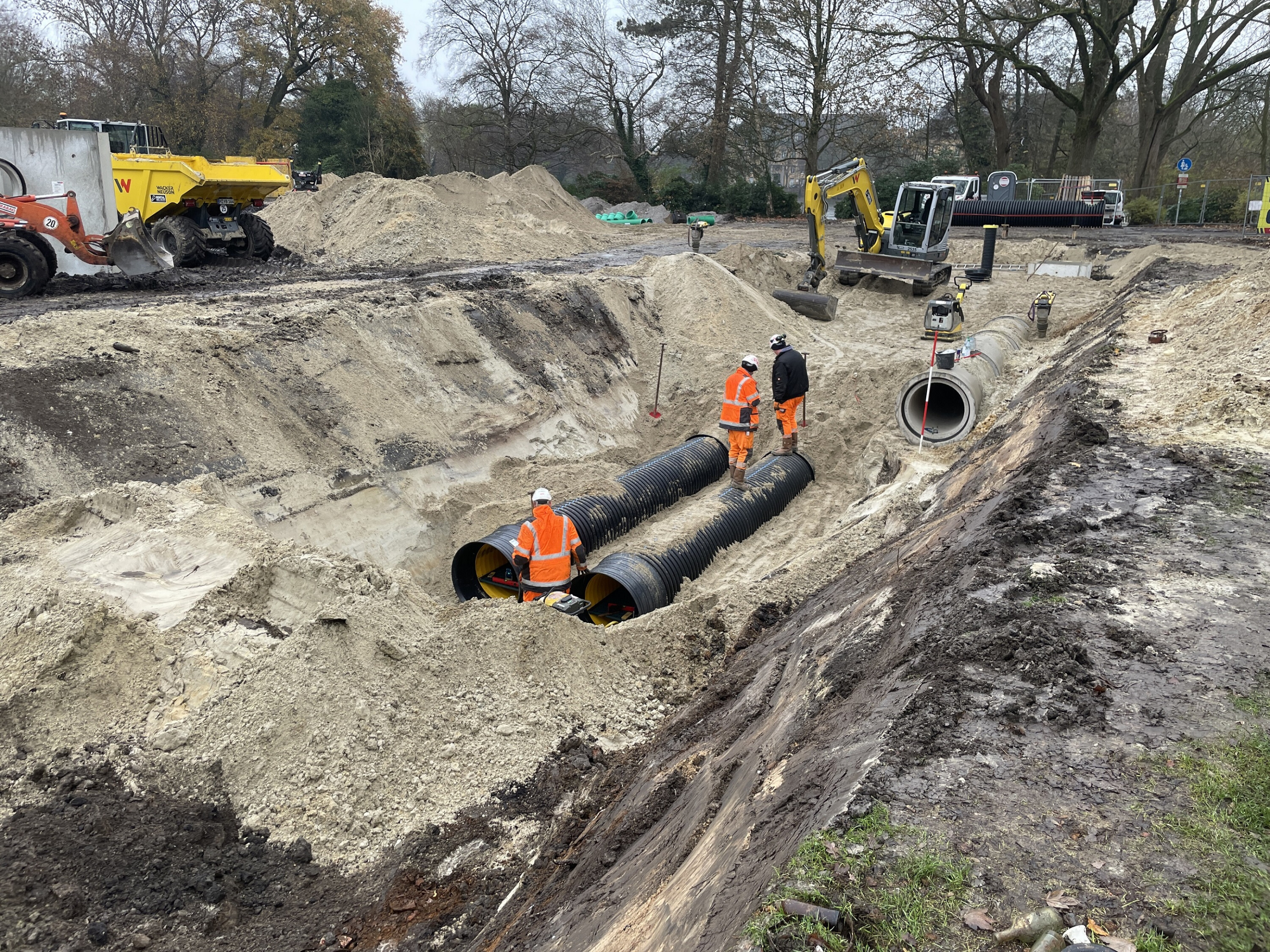 Seit November dieses Jahres wird unter einem Teil der Dobbenwiese ein neuer Regenwasserkanal verlegt. Er soll künftig das Niederschlagswasser der angrenzenden Siedlungsflächen aufnehmen und kontrolliert in die Dobbenteiche ableiten. Damit das Wasser vor der Einleitung in die Teiche gereinigt werden kann, entsteht zusätzlich eine Regenwasserbehandlungsanlage. „Da das Niederschlagswasser im Einzugsgebiet des neuen Kanals zum Teil auf stark frequentierten Verkehrsflächen anfällt und somit behandlungsbedürftig ist, muss es vor Ort gereinigt werden. Die dafür erforderliche Behandlungsanlage befindet sich derzeit im Bau“, erklärt Christian Flitz, Fachplaner beim OOWV. Die Anlage besteht aus zwei parallel verlaufenden Rohrsträngen, in denen sich Schmutzpartikel absetzen und Schwimmstoffe wie Öle und Fette zurückgehalten werden. Diese Stoffe können anschließend im Rahmen der regelmäßigen Reinigung gezielt entnommen und entsorgt werden. Ergänzt wird die Anlage durch einen dritten Rohrstrang, den sogenannten Bypass.