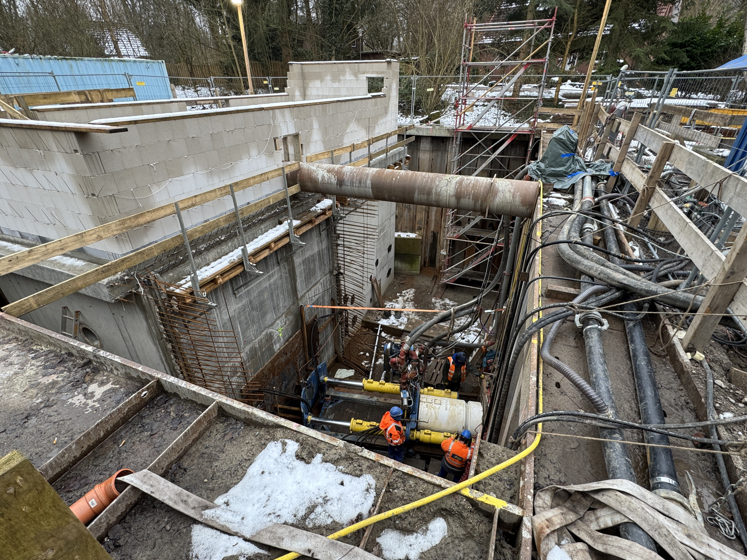Im Zielschacht waren bereits Vorbereitungen getroffen worden. Der Schacht mit einem Durchmesser von 3,20 Metern hat eine Betonummantelung. An der Stelle, an der der Bohrer ankommen sollte, musste eine Kernbohrung mit einem Durchmesser von einem Meter vorgenommen werden. Dort sollte der Schmutzwasserkanal schließlich ankommen. Damit ist ein weiterer Meilenstein im Bau des neuen Pumpwerks erreicht worden.