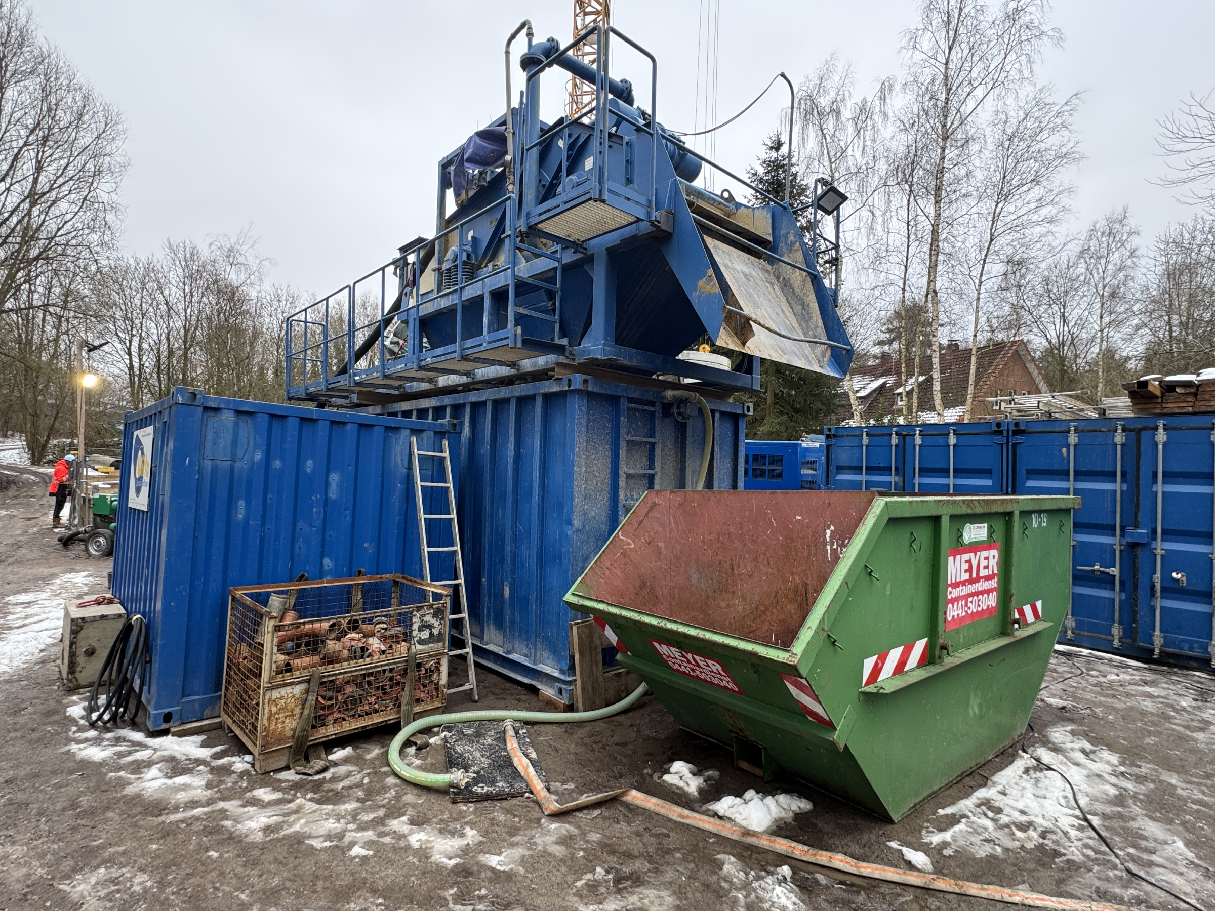 In der Baugrube für das neue Pumpwerk, in der auch das Pumpengebäude bereits Gestalt annimmt, wurde der Bohrkopf von den Fachleuten der Witte Spezialtiefbau GmbH (Berlin) in Stellung gebracht. Er wurde anschließend hydraulisch mit den Rohren ins sandige Erdreich gedrückt. Unterstützt wurde der Rohrvortrieb mit viel Wasser. Dadurch wurde ein Gemisch aus Wasser und Erdreich hergestellt, das an die Oberfläche gepumpt werden konnte. Dort wurde das Gemisch wieder getrennt. Das Bohrgut blieb an der Oberfläche, während das Wasser wieder zum Bohrkopf geleitet wurde.