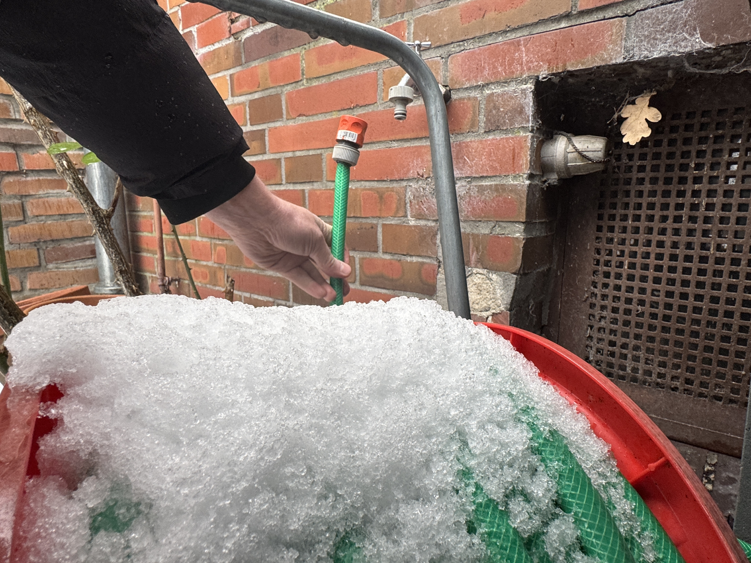 Nicht vergessen werden sollten Gartenschläuche, die – eventuell noch mit Wasser gefüllt – im Garten überwintern. Auch sie sollten entleert werden. Das gilt ebenso für Regentonnen. Denn gefriert Wasser zu Eis, dehnt es sich um bis zu zehn Prozent aus. Das kann dazu führen, dass gefüllte Regentonnen undicht werden oder gar platzen. Beim Entleeren sollte der Entnahmehahn an der Tonne nicht vergessen werden.