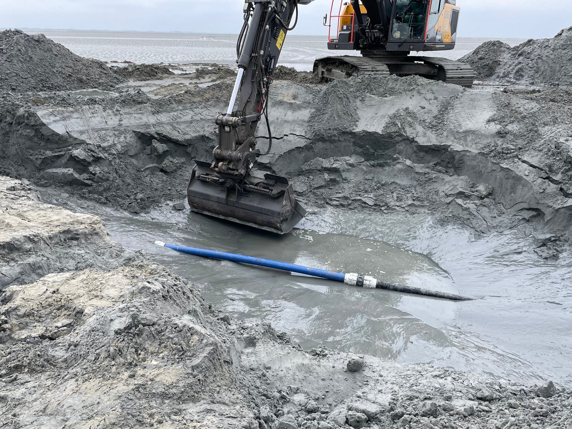 Für diesen Reparatureinsatz war frühes Aufstehen und Hand-in-Hand-Arbeit von mehreren Wattenmeer-erfahrenen Partnern gefragt – sowie im Vorfeld ein komplexes Zusammenspiel verschiedener Behörden. Noch vor dem Morgengrauen waren drei mit extrabreiten Kettenlaufwerken ausgestattete Bagger der ostfriesischen Baufirma Jeschke im Hafen Harlesiel auf ein Arbeitsboot der Wittmunder Reederei Warrings gerollt. Dieses ließ sich einige Stunden später mitten im Watt, gut vier Kilometer vom Festland entfernt, trockenfallen – und für den Bautrupp des Wilhelmshavener Unternehmens Ludwig Freytag und die unterstützenden OOWV-Kollegen begann die Uhr zu ticken. „Das Zeitfenster für die Reparatur ist kurz, es stehen maximal drei Stunden zur Verfügung, bis das Wasser wiederkommt“, beschreibt Matthias Ziegs die Herausforderung. Er ist Leiter der OOWV-Betriebsstelle in Schortens, deren Team die 7,5 Kilometer lange Wattleitung vom Festland aus technisch betreut. Dabei arbeitet er eng mit Kai Selke zusammen, Anlagenkoordinator für das Wasserwerk Wangerooge, das als Speicherpumpwerk genutzt und ansonsten für den Notfall bereitgehalten wird.